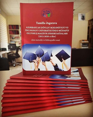 2. Əsgərova, T. Azərbaycan Dövlət Mədəniyyət və İncəsənət Universitetində müdafiə olunmuş magistr dissertasiyaları (2012-2020-ci illər) : elmi-metodik və biblioqrafik vəsait / Tamilla Əsgərova ; elmi məsləh. : G.Əliyeva-Kəngərli ; ön söz : S.Əliyeva ; ixtisas red.: N.Mürsəlov ; rəy.: A.Abdullayeva, P.Kazımi ; Azərbaycan Dövlət Mədəniyyət və İncəsənət Universiteti. - Bakı : ADMİU, 2021. - 80 s. Vəsait ADMİU-da magistr dissertasiyalarının tərtibinə dair ümumi qaydaları özündə əks etdirir. İlk dəfədir ki, ADMİU-da 2012-2020-ci illərdə müdafiə olunmuş və Kitabxana-informasiya Mərkəzinin fondunda saxlanılan magistr dissertasiyalarının biblioqrafik göstəricisi bu vəsaitdə oxuculara təqdim edilir. Dissertasiyalar Universal Onluq Təsnifat (UOT) cədvəllərinə əsasən fakültələrə uyğun olaraq elm sahələri üzrə sistemləşdirilib. Elmi-metodik və biblioqrafik vəsait ADMİU-nun professor-müəllim heyəti, tələbə və magistrantlarının istifadəsi üçün nəzərdə tutulub.