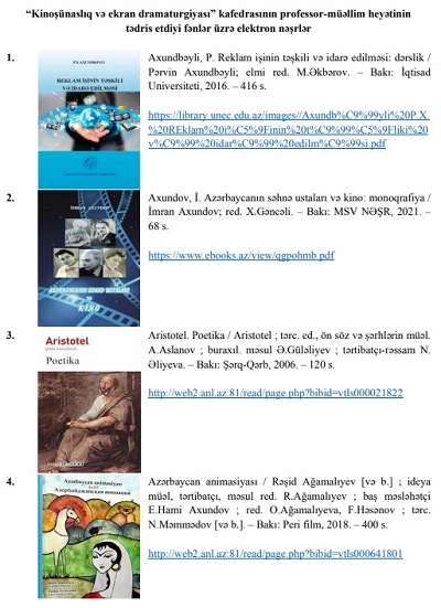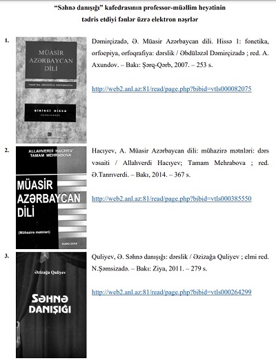 Kitabxana-İnformasiya Mərkəzinin rəqəmsal məlumat bazasında ADMİU-nun "Səhnə danışığı" kafedrası üzrə tədris olunan fənlərə dair tədris nəşrlərinin elektron versiyası informasiya tələbatçılarına təqdim olunur.