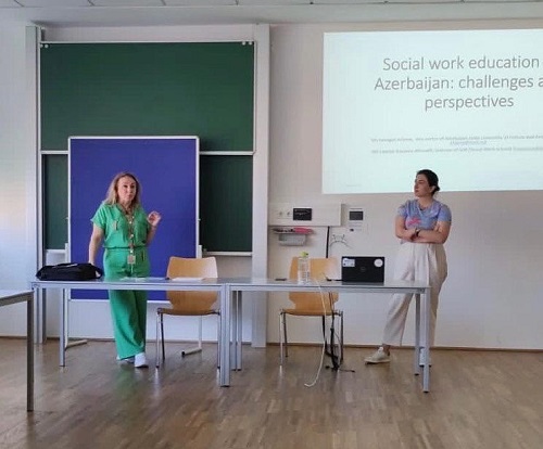 İyunun 2-də ADMİU-nun təqdimatı baş tutub. Universitetin prorektoru S.Əliyeva “ADMİU-da sosial iş ixtisasının yaranması, inkişafı və müasir perspektivləri” mövzusunda məruzəylə çıxış edib. Çıxış zamanı həm ADMİU-nun tanıtım videosu, həm də “Sosial iş” ixtisasının 2015-ci ildən fəaliyyət göstərməsiylə bağlı video-çarx yayımlanıb. Qeyd olunub ki, ADMİU-da sözügedən ixtisas yaradıldıqdan sonra başqa universitetlərdə və xaricdə təhsil almış gənc mütəxəssislər müəllim kimi dəvət olunublar. Onlar Lamiyə Rzayeva-Əhmədli və Xanbala Əhmədlidir. Qısa zamanda Ailə, Qadın və Uşaq Problemləri üzrə Dövlət Komitəsi ilə qarşılıqlı əməkdaşlıq yaradılıb və peşəkar kadrlar universitetə cəlb olunub. İki il sonra magistratura səviyyəsində də “Sosial iş” ixtisası yaradılıb. Bu illər ərzində üç böyük beynəlxalq konfrans keçirilib və həmin konfranslarda iştirak edən xarici mütəxəssislər universitetdə ustad dərsləri keçmələri üçün dəvət olunublar. Onların arasında Yuxarı Avstriya Tətbiqi Elmlər Universitetinin professoru Dr. Kristian Ştark da olub. S.Əliyeva çıxışında qeyd edib ki, sosial iş ixtisası ADMİU-da art terapiya istiqamətində də öyrənilir və tətbiq edilir. Sonda prorektor Yuxarı Avstriya Tətbiqi Elmlər Universitetinin rəhbərliyinə Qarabağ motivli hədiyyə təqdim edib.