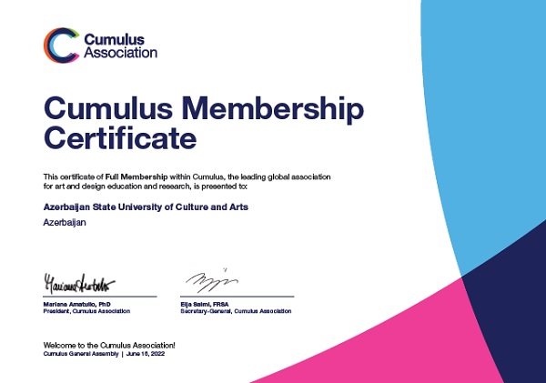 Bu ildən etibarən Azərbaycan Dövlət Mədəniyyət və İncəsənət Universiteti (ADMİU) “Cumulus incəsənət, dizayn və media sahələrində ali təhsil müəssisələrinin qlobal birliyi”nin üzvü olub. Hazırda universitet ölkəmizi Assosiasiyada təmsil edən ilk və yeganə universitetdir.