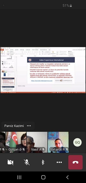Daha sonra “İndeksləşən məlumat bazaları və elmi məqalələrə qoyulan tələblər” mövzusunda tarix üzrə fəlsəfə doktoru, dosent Pərviz Kazımi çıxış edib. O, təlim iştirakçılarına indeksləşən və arxivləşən məlumat bazaları, ödənişli və ödənişsiz məlumat bazaları, elmi müəssisə, elmi jurnal, müəllif və məqalələrin indeksləşməsi, metriks ölçülər və reytinqlərin hesablanması, akademik profillərin yaradılması, elmi məqalələrin format və sair mövzularda geniş məlumat verib.