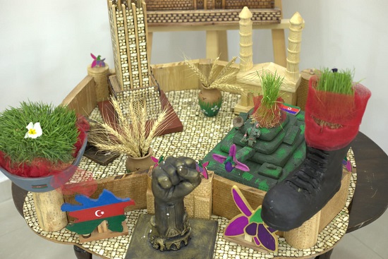 Hazırkı sərgidə də Mərkəzdə müxtəlif peşələrə yiyələnən 14 nəfərin “Zəfər”, “Şuşa”, “Azərbaycan tarixi” və “Novruz” və digər mövzu-bölmələr üzrə 500-ə yaxın sənət nümunəsi nümayiş olunur.