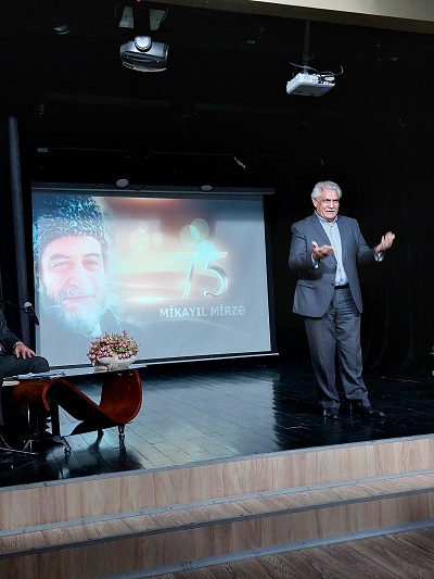 Tədbirin aparıcısı sənətşünaslıq üzrə fəlsəfə doktoru Elçin Cəfərov mərhum Xalq artistinin həyat və yaradıcılığı haqqında danışıb: “Bu gün onu təqdim etmək üçün birinci hansı sözü işlədim, bilmirəm - aktyormu, rejissormu, ictimai-siyasi xadimmi, millət vəkilimi, pedaqoqmu? İçimdən aktyor demək keçir. Aktyor Mikayıl Mirzə. Məncə, Tanrı onu bu missiya ilə həyata gətirmişdi. Adil İsgəndərov, Mehdi Məmmədov, Tofiq Kazımov, Lütfi Məmmədbəyov, Müxlis Cənizadədən və Ağaəli Dadaşov kimi görkəmli səhnə ustalarından dərs alan Mikayıl Mirzə teatrda Səməd Vurğunun "Vaqif" və "Fərhad və Şirin" əsərlərindən Kürd Musa, Fərhad obrazlarını, İlyas Əfəndiyevin "Qəribə oğlan" və "Bizim qəribə taleyimiz" pyeslərində Muratov və Eyvaz, Mirzə İbrahimovun "Kəndçi qız" pyesindən Aslan, Bəxtiyar Vahabzadənin "Fəryad" əsərində Zahid,Cəfər Cabbarlının "Od gəlini" pyesində Elxan, Cəlil Məmmədquluzadənin "Dəli yığıncağı" əsərində Cinli Mustafa, Hüseyn Cavidin "İblis" pyesində İxtiyar və bu kimi obrazları yüksək bacarıq və ustalıqla canlandırıb.