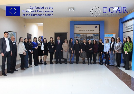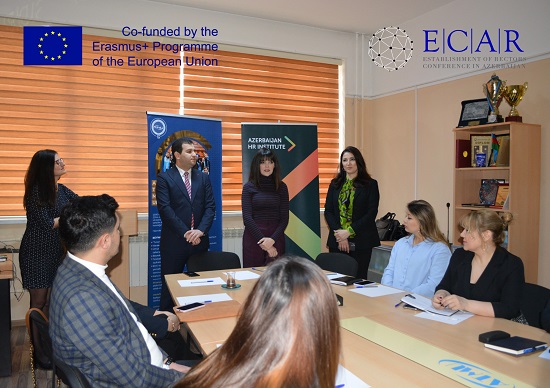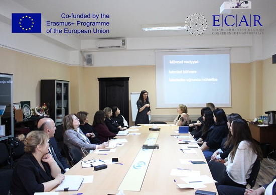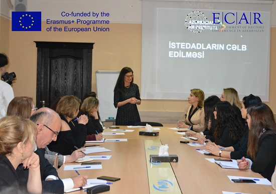 Daha sonra ECAR layihəsinin koordinatoru, Bakı Biznes Universitetinin Universitet-sənaye əməkdaşlığı şöbəsinin müdiri Gülşən Bayramova çıxış edərək ECAR layihəsinin əsas məqsədlərindən birinin Ali təhsil Müəssisələrinin idarəetmə bacarıqlarının inkişafı olduğunu nəzərə alaraq İnsan resurslarına dair təlimlərin təşkilinə xüsusi önəm verildiyini vurğulayıb.