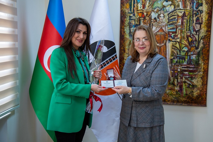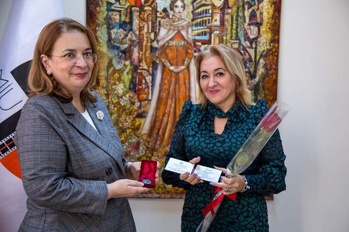 Azərbaycan Dövlət Mədəniyyət və İncəsənət Universitetinin 100 illik yubileyi münasibəti ilə dövlət başçısının müvafiq sərəncamlarını xatırladan xanım rektor ali təhsil ocağının bir sıra əməkdaşlarının dövlət təltifləri ilə mükafatlandırıldığını, bir sıra əməkdaşın isə Elm və Təhsil naziri Emin Əmrullayev tərəfindən döş nişanı və fəxri fərmanlara layiq görüldüyünü diqqətə çatdırıb, bu təltifləri universitetlə yanaşı, onların yaradıcılıqlarına, fəaliyyətlərinə göstərilən böyük etimad kimi dəyərləndirib.