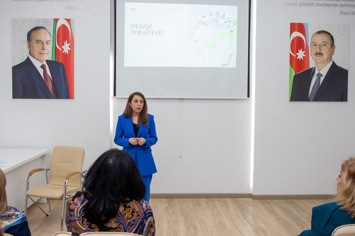 Sonra ADMİU-nun sözügedən kursda iştirak etmiş müəllimlərindən Aysel Əzizova tərəfindən Musiqi terapiyası haqqında məruzə dinlənilib. Məruzəçi musiqi terapiyasının tarixi və bu günü, tətbiq sahələri haqqında danışıb, insan psixologiyası və ruhi sağlamlığı üçün faydalarından bəhs edib.