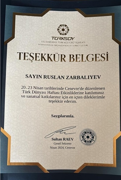 Azərbaycan Dövlət Mədəniyyət və İncəsənət Universitetinin (ADMİU) baş müəllimi, TÜRKSOY Xalq Çalğı Alətləri Orkestrinin solisti tarzən Ruslan Zərbəliyev BMT-nin İsveçrənin Cenevrə şəhərində yerləşən ofisində – “Millətlər Sarayı”nda (Palais des Nations) keçirilən Türk Mədəniyyəti Günlərində iştirak edib.